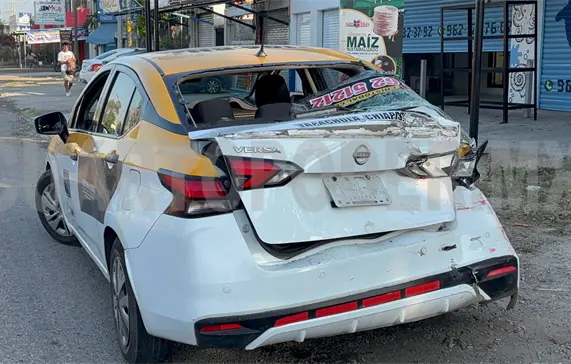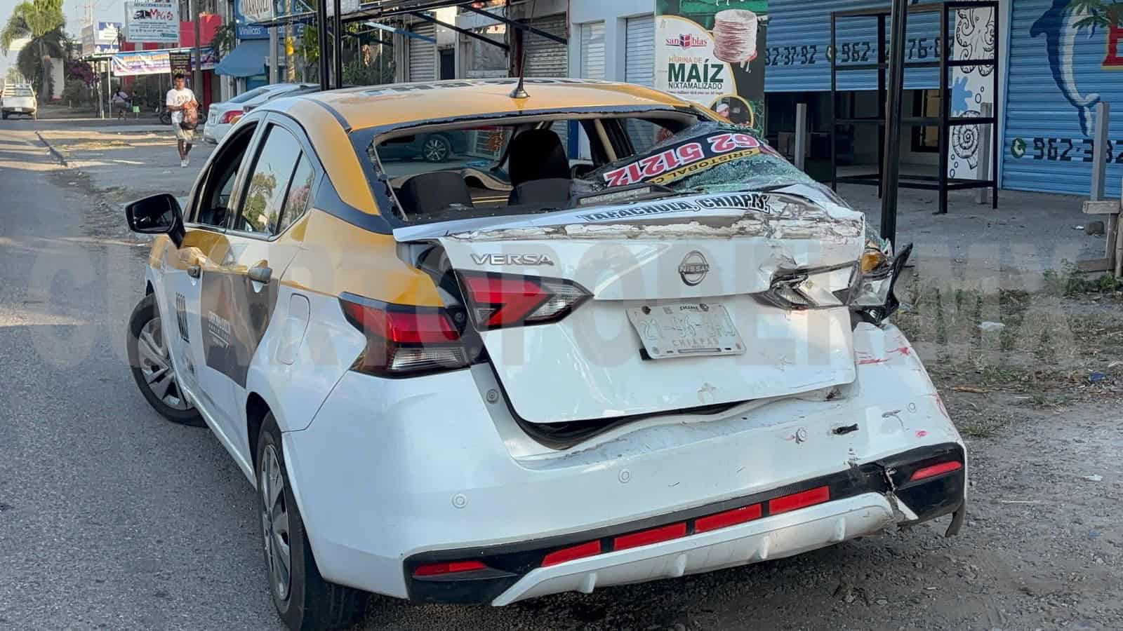 Daños materiales valuados en más de 40 mil pesos dejó como saldo un choque por alcance entre un autobús de transporte de personal y un taxi, en la ciudad de Tapachula.