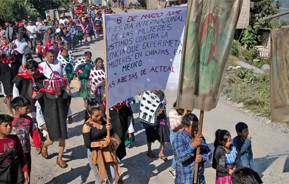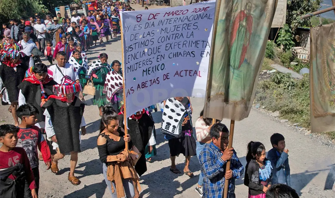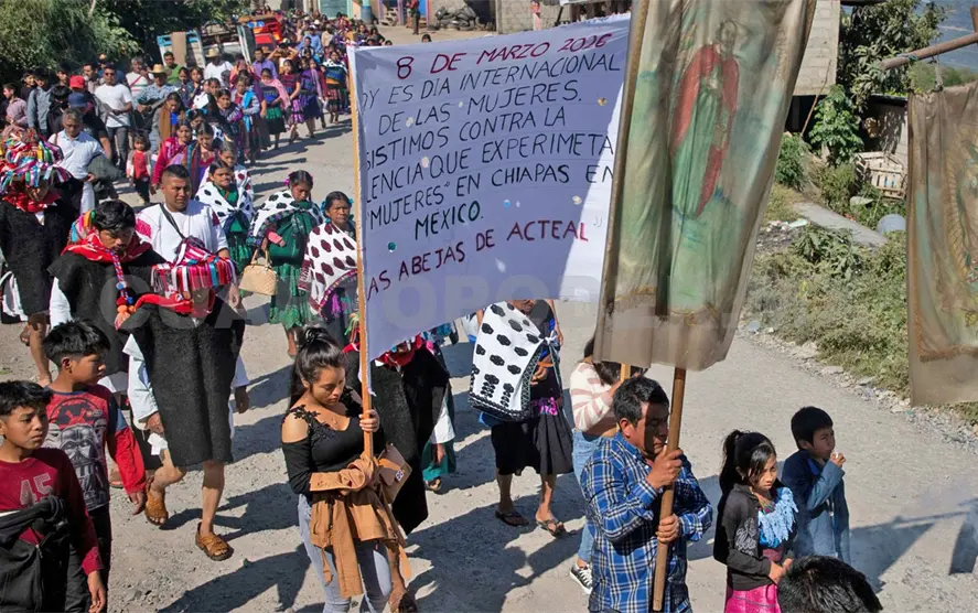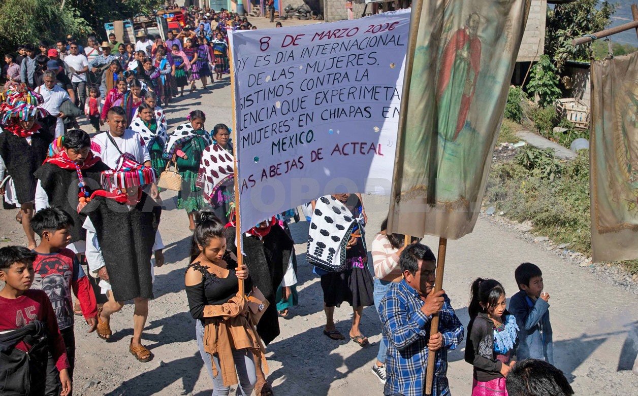 Alrededor de 400 mujeres de la organización Sociedad Civil Las Abejas de Acteal marcharon en el marco del Día Internacional de la Mujer para denunciar “la violencia machista, los feminicidios, secuestros y desapariciones de niñas y mujeres jóvenes que sufren en México y en el mundo”.