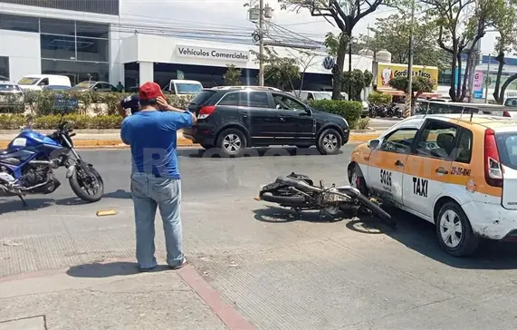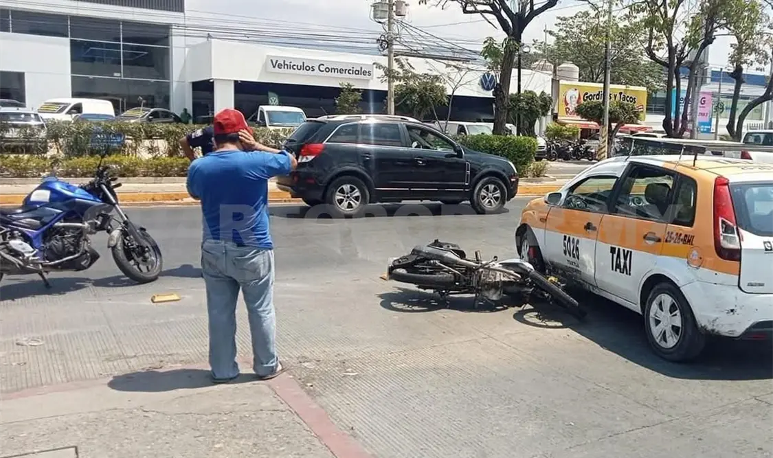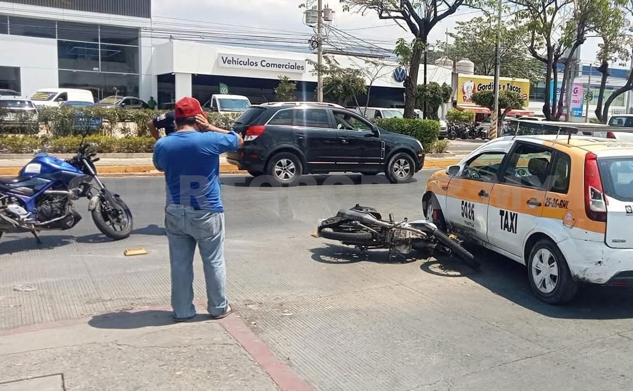 El percance ocurrió en el carril de poniente a oriente, a la altura de la calle Victórico Grajales, donde —de acuerdo con los primeros reportes— el conductor de una motocicleta Italika FT150 de color grafito, se impactó contra un taxi de la marca Ford Fiesta, con número económico 5026.